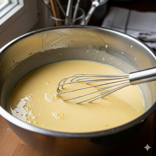 - الخلط السائل: في خلاط كهربائي، اخلطي البيض، الحليب، السكر، والفانيلا حتى يتجانس الخليط تمامًا.